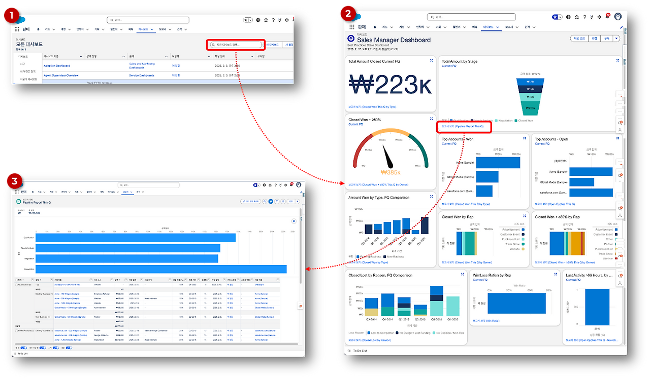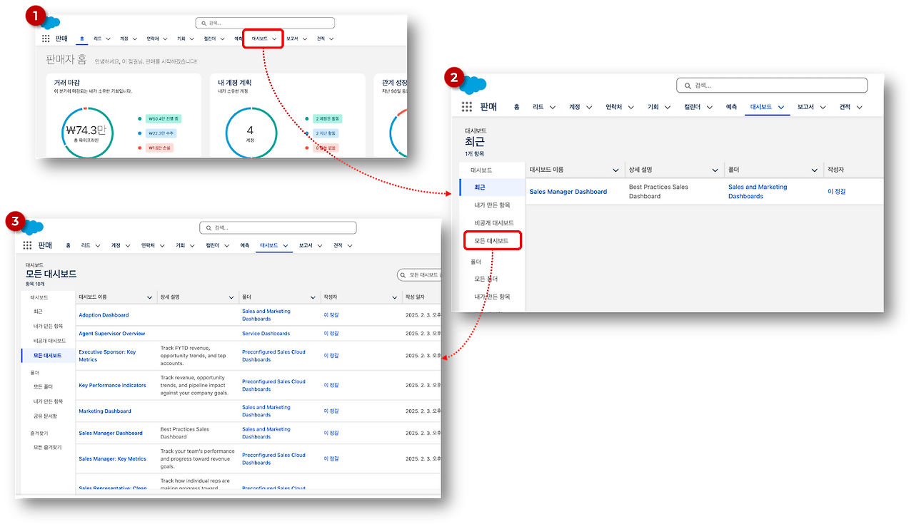 대시보드는 보고서를 사용하는 방법과 유사하다. 홈 화면에서 ‘대시보드’ 탭을 클릭하면(위 1번 그림) 대시보드 목록 윈도우가 표시된다 (위 2번 그림). 보고서와 마찬가지로 대시보드 화면에는 ‘최근’ 목록이 표시되는데 처음 대시보드 목록을 억세스하면 아무것도 없거나 대시보드가 몇개만 표시된다. 이때, 우측 사이드바의 목록들 중에서 ‘모든 대시보드’를 클릭하면 세일즈포스가 샘플로 제공하는 모든 대시보드가 표시된다 (위 3번 그림).