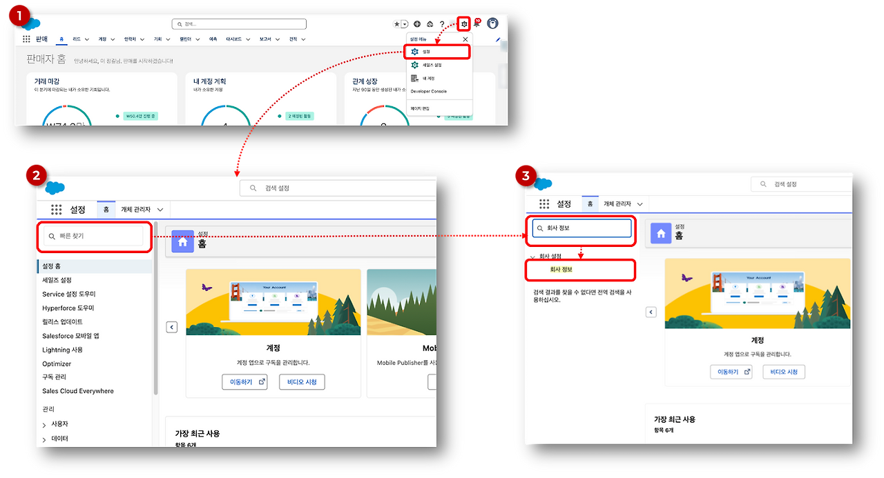 무료 체험판을 포함하여 현재 내가 사용하는 Org 에 대한 정보는 설정의 회사 정보 화면을 보면 쉽게 파악이 가능하다. 홈화면 우축 상단의 기어모양 아이콘을 클릭한 후 보여지는 메뉴에서 ‘설정’을 선택하자. (아래 그림 1번)