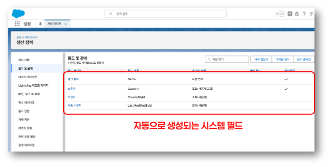 테이블, 즉 개체를 구성하는 필드의 경우도 개체와 유사하게 시스템에서 사용하기 위하여 자동으로 생성하는 ‘시스템 필드’와 사용자가 추가하는 ‘사용자 정의 필드’로 구분해 볼 수 있다. 새로운 사용자 정의개체를 만들면 아래와 같은 시스템 필드, 즉 시스템에서 사용하기 위한 목적의 표준 필드가 자동으로 생성된다. 예를 들어, 생산 장비 목록을 관리하기 위한 목적으로 ‘생산 장비’라는 개체를 만들기 위해 기본적인 개체를 생성하면 아래와 같은 필드들이 자동으로 생성된다. 참고로 해당 필드는 삭제하거나 수정이 불가능하다.