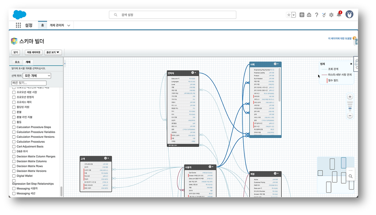 하지만 오브젝트의 근간이 되는 개념이 데이터베이스의 테이블, 필드이다 보니 데이터베이스의 개념이 적용되므로, 테이블의 키필드, 테이블간의 관계, 즉 Patent/Child 관계와 같은 개념을 포함한다. 세일즈포스가 제공하는 ‘스키마 빌더’ 를 이용하면 아래와 같은 개체(Object) 들의 관계를 확인할 수 있다.
