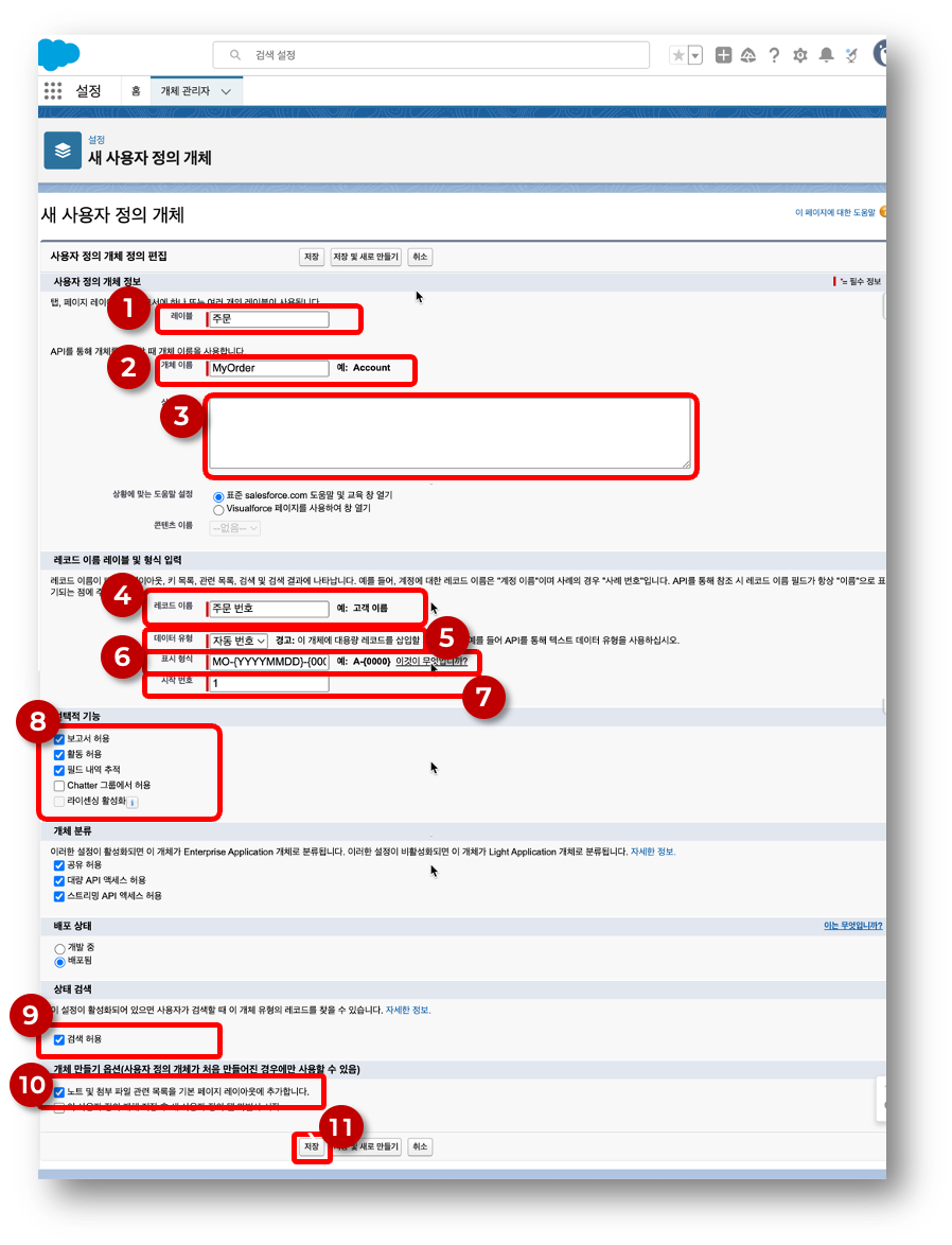 - 레이블 = ‘JL 주문’ : 화면의 탭이나, 개체 참조시 보는 개체의 이름이다. 세일즈포스에서 기본으로 제공되는 ‘주문’과 구별을 목적으로 주문 앞에 영문자 2글자를 임의로 추가한다.