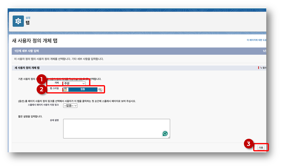 ‘개체’ 항목 을 클릭하여 표시된 선택 목록에서 ‘주문’을 선택하고(위 그림, 1번), 앱스타일에서 적절한 아이콘을 골라 선택한다(위 그림 2번). 하단 우측의 ‘다음’버튼을 클릭하여 다음 화면으로 이동한 후, 표시된 설정을 그대로 두고 ‘다음’ 버튼을 눌러 그 다음 화면으로 이동후, 하단의 ‘저장’버튼을 클릭하면 탭이 만들어 진다.