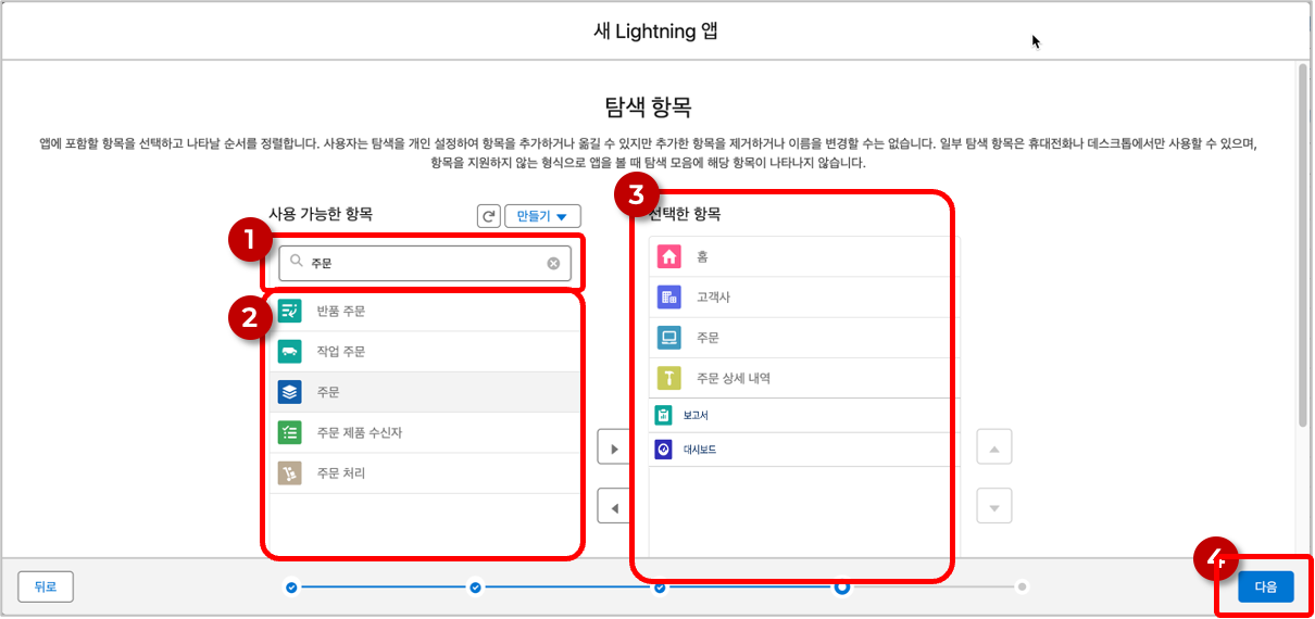 홈 화면으로 돌아가서 우측 상단의 앱메뉴 (점 아홉개가 와플처럼 보인다고 해서 ‘와플 메뉴’라고도 한다.) 를 클릭하면(위의 그림 1번) 사용자가 억세스할 수 있는 앱들이 표시되는데 아직 우리가 만든 ‘주문 관리’ 앱은 보이지 않는다. 메뉴 하단의 ‘모두 보기’를 클릭하면(위의 그림 2번) 앱시작 관리자 화면이 표시되는데, 아래로 스크롤 해보면 맨 아래에 ‘주문 관리’ 앱이 보일 것이다. (위의 그림 3번), 앱을 드래깅해서 좌측 상단으로 옮겨 놓자(위의 그림 4번). 이렇게 하면 다음 부터는, 앱메뉴를 클릭하면 우리가 만든 앱이 맨위에 표시될 것이다. ‘주문 관리’ 앱을 클릭해보면 아래와 같이 우리가 선택한 탭들이 보일 것이다.