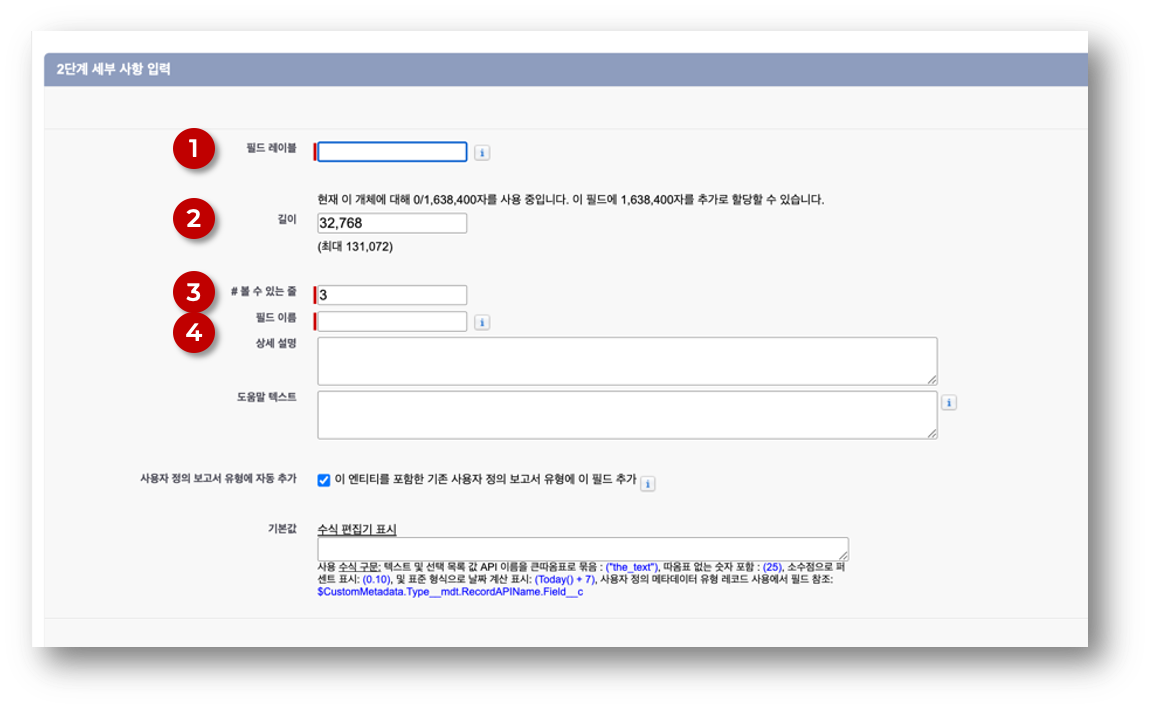 ⓶ 길이 = ‘32,768’ : ‘긴 텍스트 영역’ 필드에 입력할 수 있는 글자 수를 지정한다. 최대 131,072 자까지 가능하다. ‘긴 텍스트 영역’ 유형 필드는 ‘텍스트’ 필드와는 달리 Sort 나 검색이 제한된다.