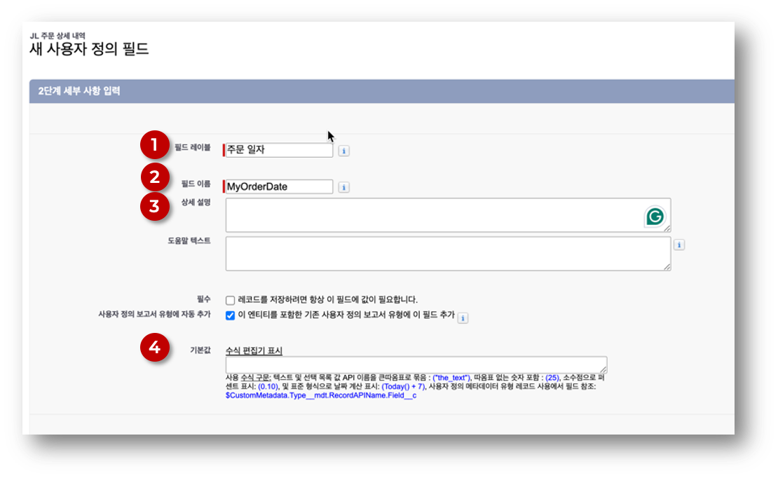 ⓶ 필드 이름 = ‘MyOrderDate’ : API 를 위해 저장되는 이름. 필드의 이름은 개체 안에서 고유한 이름이어야 한다.