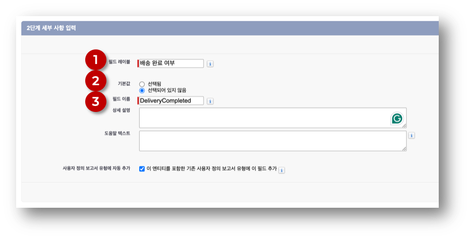 ⓷ 필드 이름 = ‘DeliveryCompleted’ : API 를 위해 저장되는 이름. 필드의 이름은 개체 안에서 고유한 이름이어야 한다.