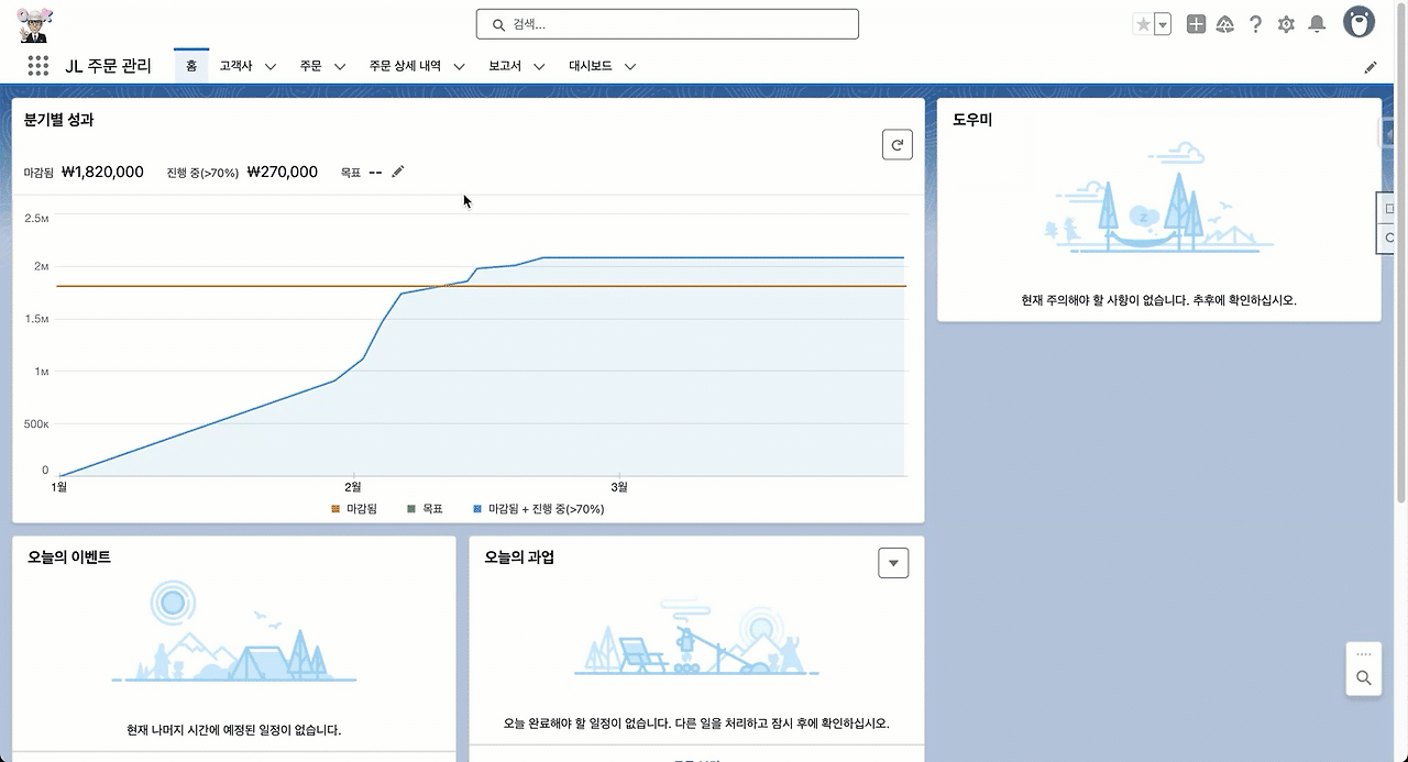 | 설정 > 개체 관리자 > 목록에서 ‘JL 주문’ 개체 선택 > 필드 및 관계 (좌측 사이드바) |