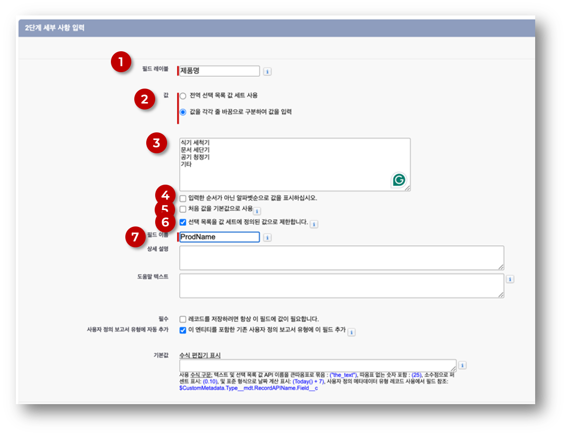 ⓻ 필드 이름 = ‘ProdName’ : API 를 위해 저장되는 이름. 필드의 이름은 개체 안에서 고유한 이름이어야 한다.