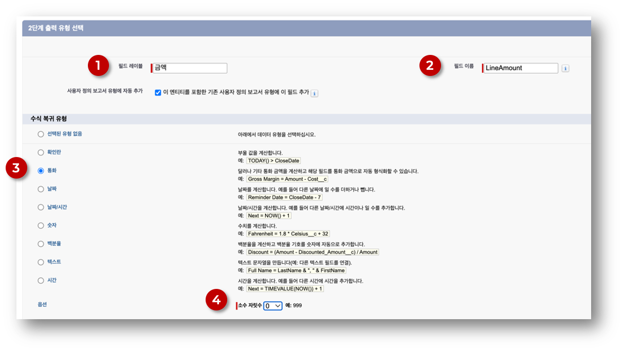 ⓷ 수식 복귀 유형 = ‘통화’ : 수식의 결과 데이터 유형.