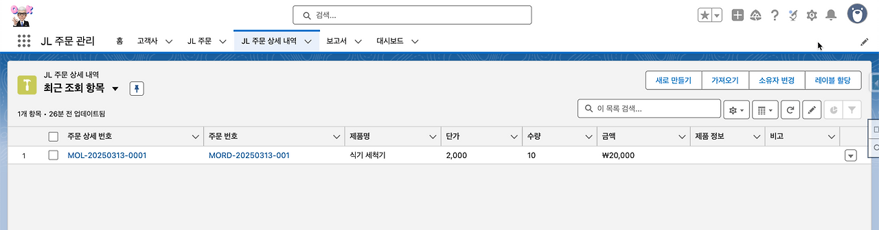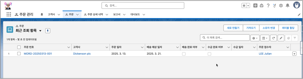 다시 ‘JL 주문’ 탭을 클릭하여 목록 화면으로 돌아가서 브라우저는 ‘새로 고침’ 하면 아래와 같이 목록에 표시되는 필드가 변경된 것을 확인할 수 있다.
