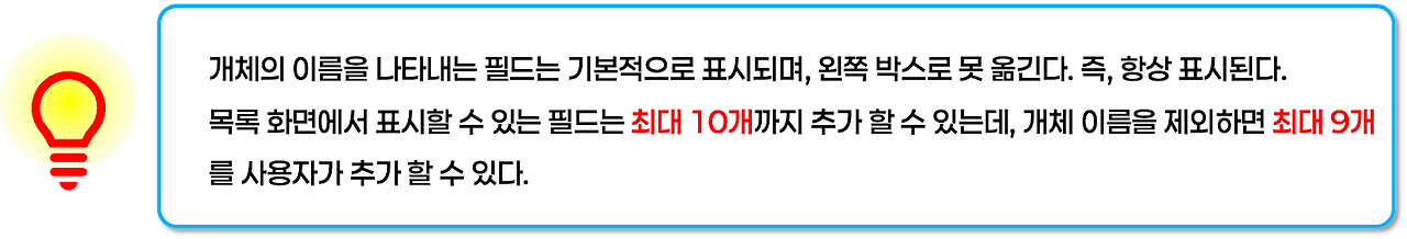 ‘검색 레이아웃’의 경우 유사하게, 위 그림의 1번 박스는 현재 개체의 모든 필드들의 목록이고, 3번 박스는 목록에서 표시되는 필드 목록은 목록 화면에서 표시되는 필드들로, 실제 표시되는 화면에서는 위에서 아래의 순서대로 왼쪽에서 오른쪽으로 나열된다. 즉, 1번 박스에 표시된 필드들중 표시할 필드를 선택하고 그림 2번의 버튼을 사용, 왼쪽 박스에서 오른쪽 박스로 이동시킬 수 있고, 이동 시킨 후에는 4번에 표시된 버튼을 이용하여 아래 위로 조정하여 표시된 순서를 변경 할 수 있다.