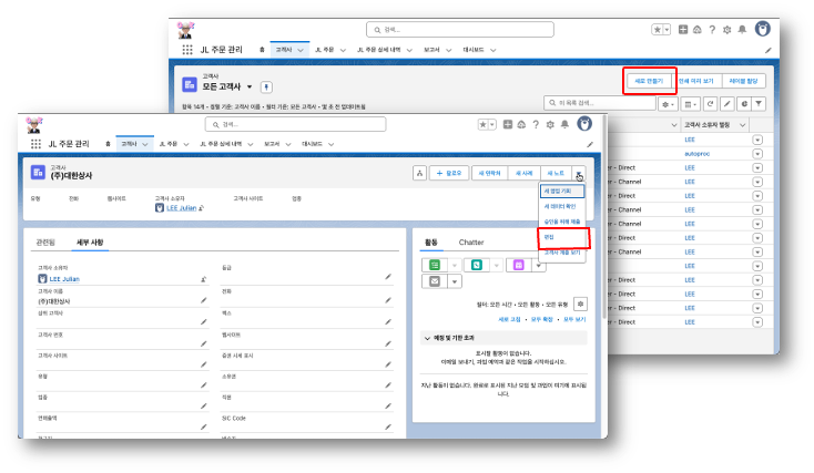 이렇게 함으로서, ‘홍길동’ 사용자는 프로필에 따르면 신규 고객사를 ‘추가’ 하거나 고객사 정보를 ‘편집’ 할 수 없지만 새로 만들어진 ‘권한 집합’ 에 의해 신규 고객사를 ‘추가’ 하거나 고객사 정보를 ‘편집’ 할 수 있게 되었다. ‘홍길동’ 사용자로 로그인하여 ‘고객사’ 탭을 눌러 보면 목록 화면에 ‘새로 만들기’ 버튼이 추가 되었고, 레코드를 열어서 보는 세부 사항 화면에도 ‘편집’ 기능이 활성화 된 것을 확인 할 수 있다.