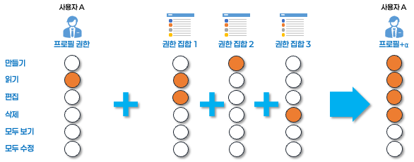 위 그림에서 특정 개체, 예를 들면 ‘고객사(Account)’ 라는 개체에 ‘읽기’ 권한을 가지고 있는 ‘사용자 A’가 있다고 가정해보자. 그리고, 아래와 같이 ‘권한 집합’ 이 정의되어 있다면;