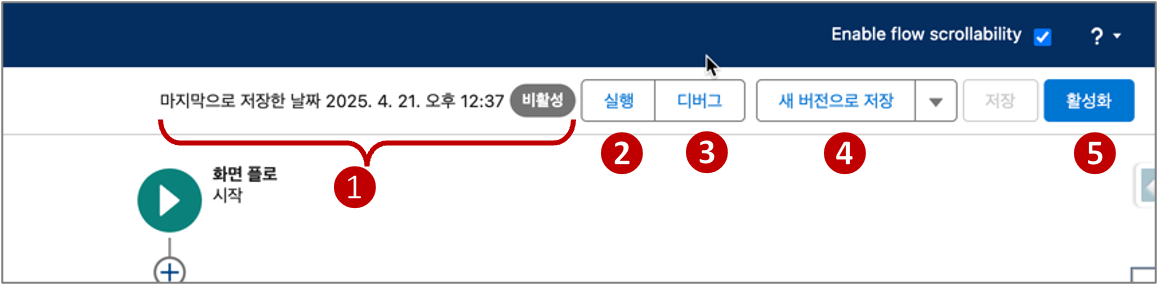 ❹ 저장 옵션 : 플로 수정시 ‘새 버젼으로 저장’ 해서 이전 버젼을 보존할 수 있고, ‘▼’ 버튼을 클릭하면 ‘새 플로로 저장’ 옵션이 있는데, 완전히 새로운 플로로 저장할 수 있다. 즉, 플로를 복제하는 것과 같다.