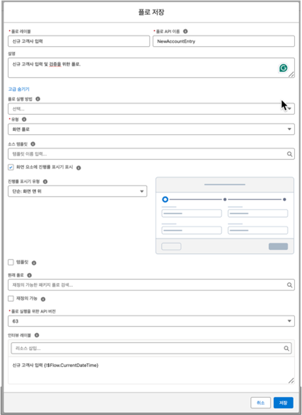 표시된 화면의 우측 상단의 ‘저장’ 버튼을 누르면 아래와 같은 화면이 표시되면서 플로의 이름과 API 이름 및 설명을 입력할 수 있다.